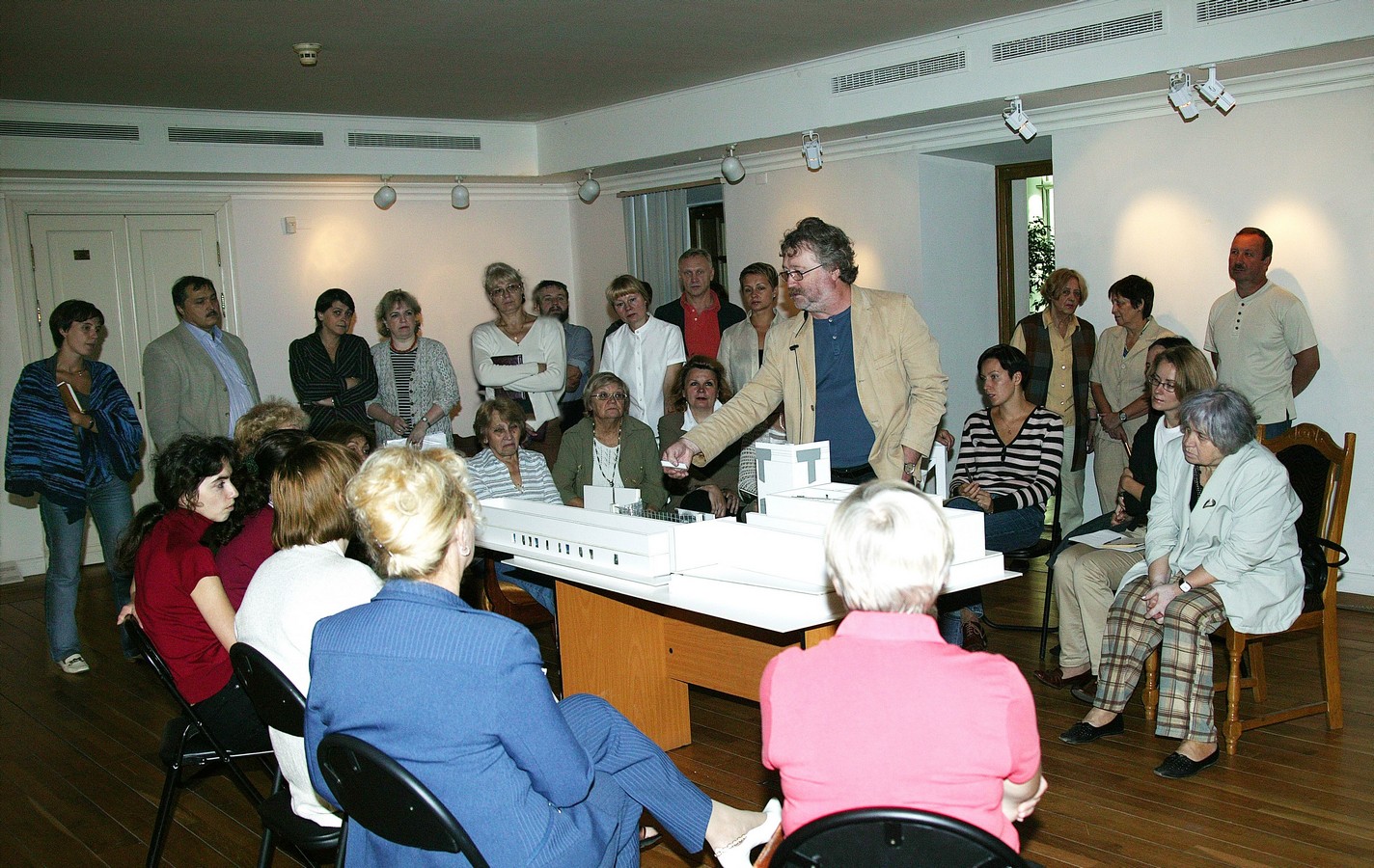 Художник А.Н. Конов и сотрудники музея на обсуждении проекта новой выставки «Пушкинские музеи России в московском музее А.С. Пушкина»
