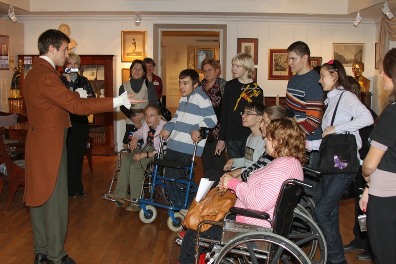имеются колясками с колесами на белой резине, предназначенные для пересадки инвалидов колясочников во избежание загрязнения полового покрытия выставочных залов.Из-за особенностей старинного здания предусмотрено использование подъемника (тип RIFF Standart LY-SA-2, грузоподъемностью до 130 кг), оборудованного для перемещения инвалидов с сопровождающим лицом до уровня площадки, откуда уже доступен лифт. В Доме-музее И.С. Тургенева предусмотрено использование подъемника (ИНВАПРОМ А1, грузоподъемностью до 410 кг.).