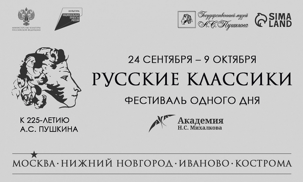 С 24 сентября по 9 октября 2024 г. в Нижнем Новгороде, Иванове, Костроме и Москве будет проходить спецпроект Академии кинематографического и театрального искусства Н.С. Михалкова «Русские классики. К 225-летию А.С. Пушкина», посвященный жизни и творчеству великого русского писателя и поэта А.С. Пушкина. Фестиваль, посвященный русским классикам, проводится Академией седьмой год подряд при поддержке Министерства культуры Российской Федерации в рамках нацпроекта «Культура».