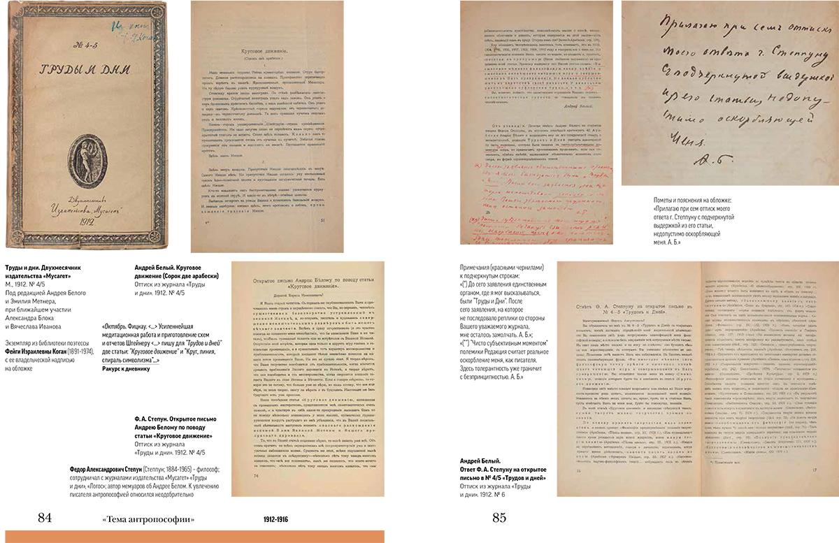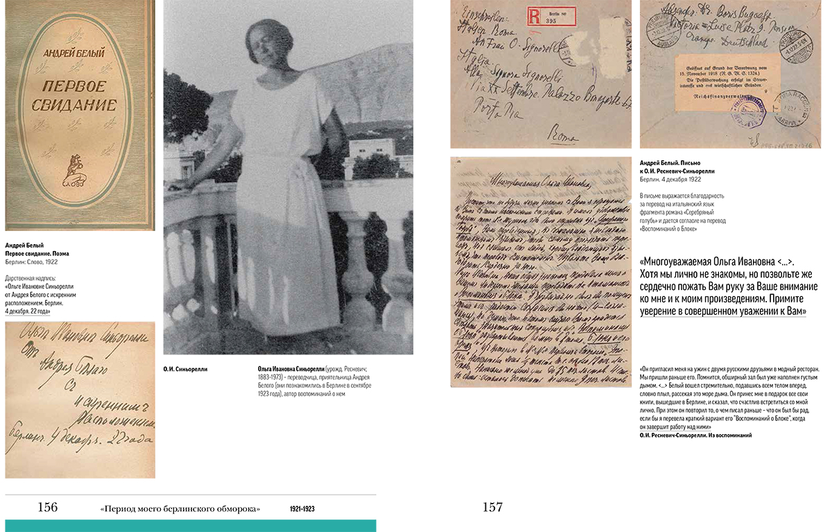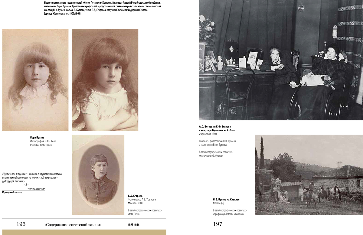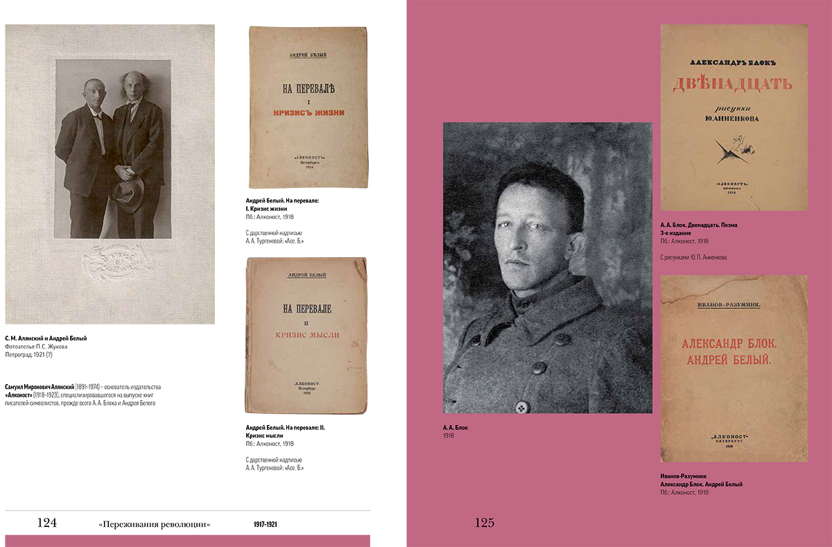 - А в качестве эпиграфа мы выбрали цитату из биографической заметки Андрея Белого 1927 года: «… единственным ключом к теме всей моей биографии (“как жить”) являются мои книги, а не перечень никому не интересных событий о том, где я чихнул…». Именно книги писателя стали основными героями альбома. Но наша задача не ограничилась воспроизведением книжных обложек. Мы представляем в альбоме не просто прижизненные издания, но их совершенно уникальные экземпляры – книги с дарственными надписями Белого и Белому, книги с владельческими штампами и росписями, книги из библиотеки писателя, сохранившие его пометы или пометы его вдовы Клавдии Николаевны Бугаевой. Кроме того, объектами нашего интереса стали друзья, родственники, знакомые, возлюбленные писателя, которые были прототипами героев его произведений, адресатами лирики и дарственных надписей; те, кто помогал в осуществлении замыслов, и те, с кем он полемизировал. В альбоме показаны обстоятельства личной жизни писателя и исторические события, которые непосредственно или опосредованно влияли на его творчество, и нашли отражение в его книгах.