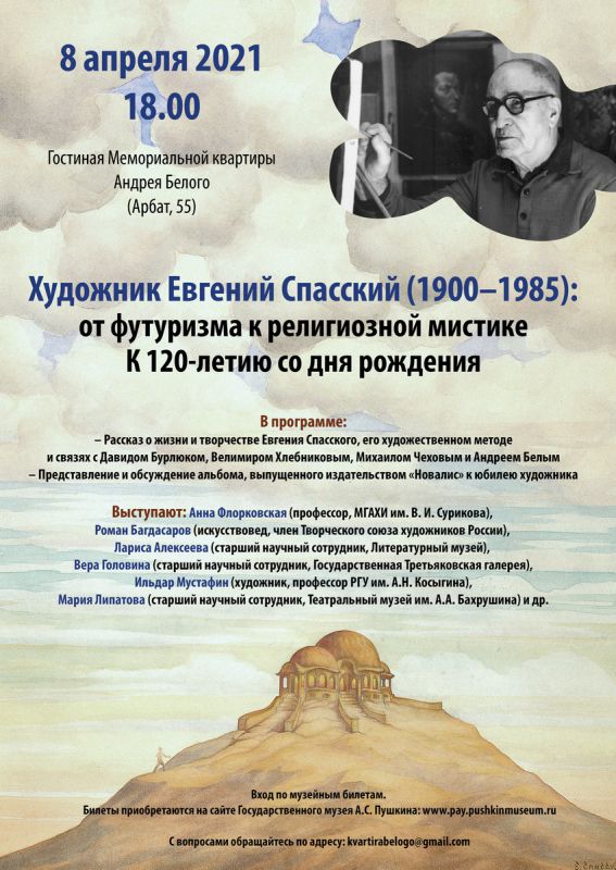 – Рассказ о жизни и творчестве Евгения Спасского (1900-1985), его художественном методе и связях с Давидом Бурлюком, Велимиром Хлебниковым, Михаилом Чеховым и Андреем Белым– Презентация и обсуждение альбома, выпущенного издательством «Новалис» к юбилею художника