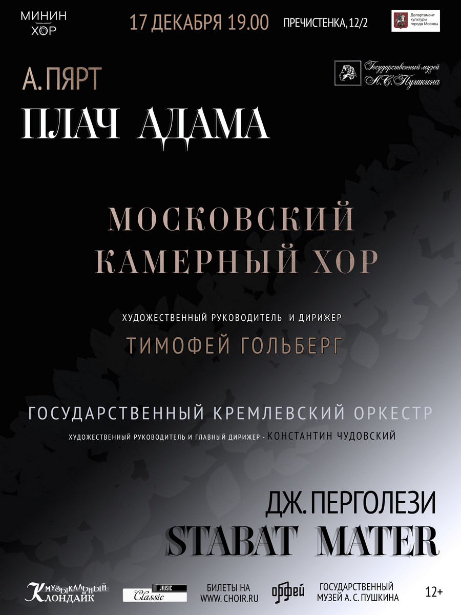 17 декабря Московский государственный академический камерный хор (Минин-хор) выступит в Государственном музее А.С. Пушкина в Москве. В программе музыка Арво Пярта и Джованни Баттиста Перголези. Вместе с Государственным Кремлевским оркестром Управления делами Президента Российской Федерации (художественный руководитель - Константин Чудовский) коллектив исполнит сочинение «Плач Адама» (Adam’s Lament) Пярта и Stabat Mater Перголези.