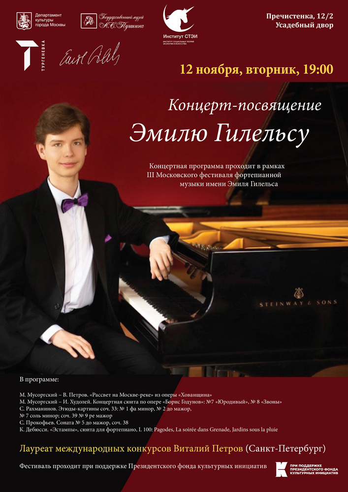 Приглашаем всех желающих в Государственный Музей А.С. Пушкина на Концерт-посвящение Эмилю Гилельсу. Концертная программа проходит в рамках III Московского фестиваля фортепианной музыки имени Эмиля Гилельса.