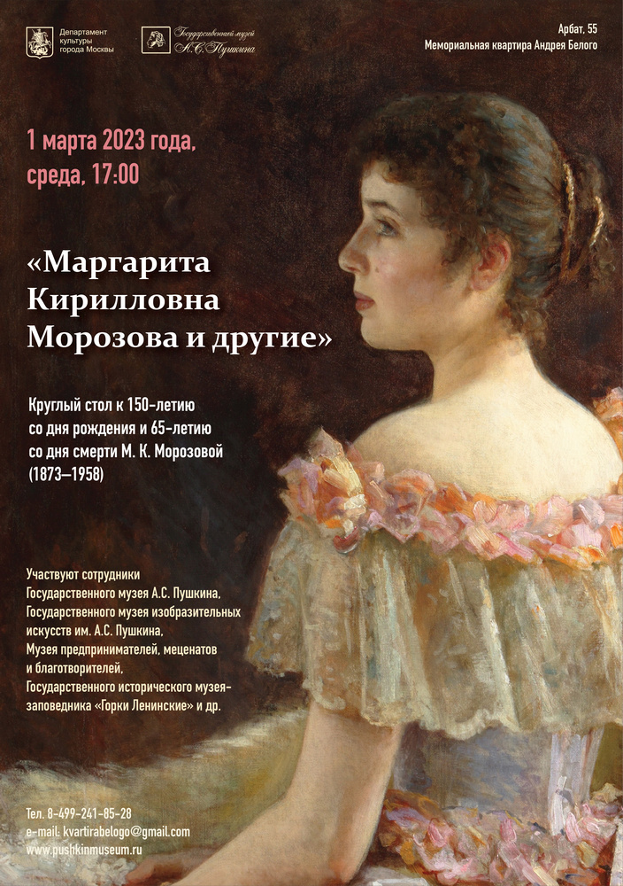 Перед мероприятием в гостиной музея можно ознакомиться с выставкой «М.К. Морозова и другие. Портреты из семьи Рогаль-Левицких. Дар Л.П. Бубновой. Из фонда Государственного музея А.С. Пушкина».