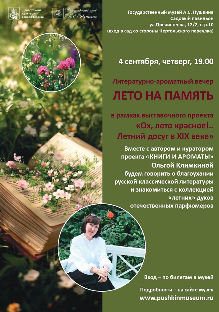 Вместе с Ольгой КЛИМКИНОЙ, автором и куратором проекта «КНИГИ И АРОМАТЫ» (Российская Государственная Детская Библиотека), мы будем говорить о благоухании русской классической литературы: о том, в каких поэтических и прозаических произведениях русской классики мы чувствуем "дыхание лета" и как, через слово писателя, мы можем «слышать» запахи сирени, липы, жасмина, свежескошенного сена, лугового разнотравья, летних цветов…