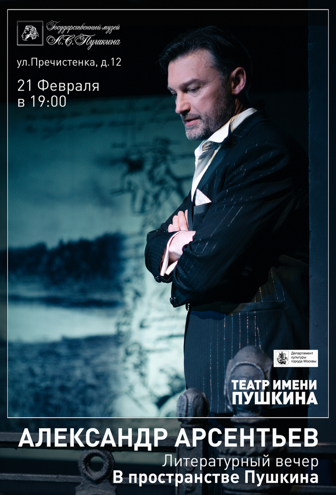 В рамках фестиваля 21 февраля на сцене Концертного зала Государственного музея А.С. Пушкина актер Московского драматического театр имени А.С. Пушкина, заслуженный артист России Александр Арсентьев читает стихи А.С. Пушкина, повесть «Метель», отрывки из «Руслана и Людмилы», «Евгения Онегина», поэму Д. Самойлова «Сон о Ганнибале», а также делится со зрителями открытиями, совершёнными благодаря погружению в творчество поэта.