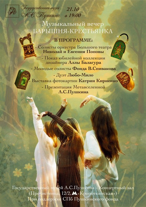 Мы будем рады видеть вас на этом уникальном событии, где как и в произведении А.С. Пушкина «Барышня-крестьянка», переплетутся страницы деревенской и усадебной жизни, а прошлое и настоящее сольются в единое целое, создавая пространство для вдохновения и открытий.