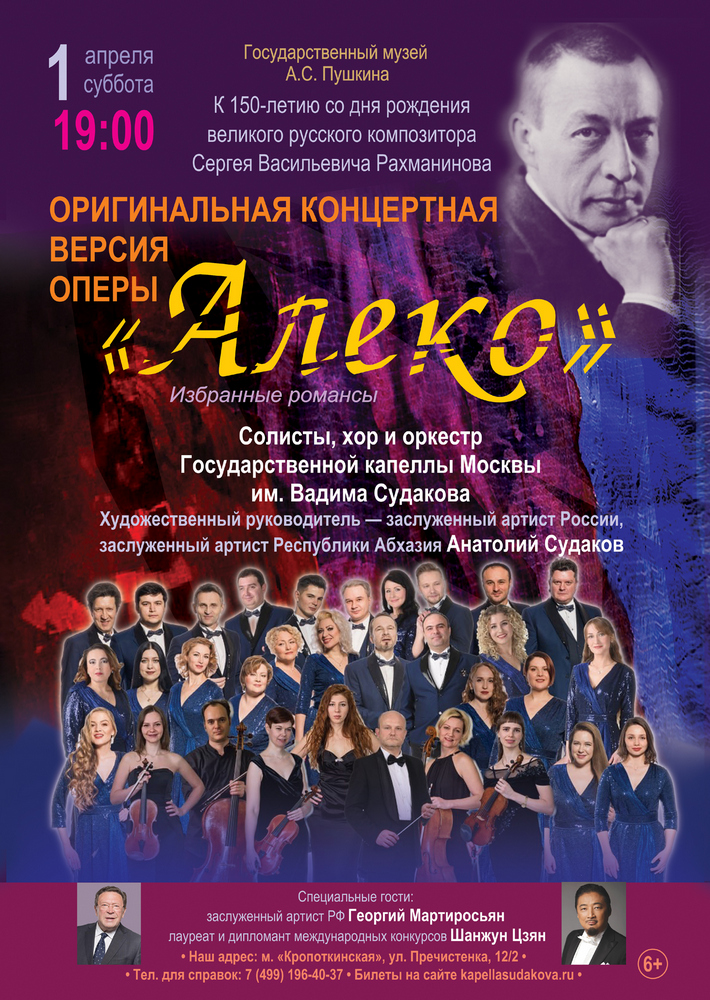 Государственная концертно-театральная капелла Москвы имени Вадима Судакова приглашает всех ценителей искусства на замечательный концерт, посвященный 150-летию со дня рождения Сергея Васильевича Рахманинова.Вы услышите оригинальную концертную версию исполнения оперы «Алеко», где музыка Сергея Рахманинова и текст Александра Пушкина сплетутся воедино благодаря солистам оперных театров, камерному оркестру, хору и известному актеру театра и кино, заслуженному артисту РФ Георгию Мартиросьяну.