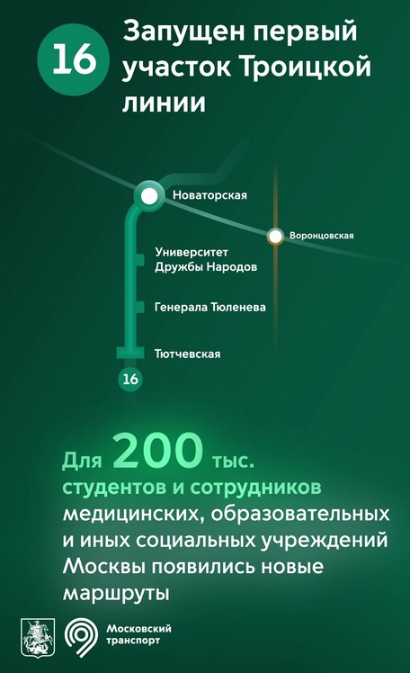 Запуск первого участка Троцкой линии Московского метрополитена станет самым длинным радиусом метро за пределами МКАД и улучшит транспортную доступность 700 тыс. жителей пяти прилегающих районов города Москвы. Троицкой линией Московского метрополитена будут пользоваться десятки тысяч учащихся, а также сотрудники крупнейших образовательных и научных учреждений города Москвы. Пассажиры получат десятки новых маршрутов для поездок по городу и смогут существенно экономить время в пути. Например, жители городского округа Троицк в городе Москве смогут добираться до БКЛ и Московского центрального кольца в 2 раза быстрее – за 35 и 45 минут соответственно. Кроме того, открытие участка Троицкой линии позволит разгрузить Калужско-Рижскую и Сокольническую линии Московского метрополитена до 20%, а также значительно улучшит транспортную доступность районов, прилегающих к новым станциям метро.