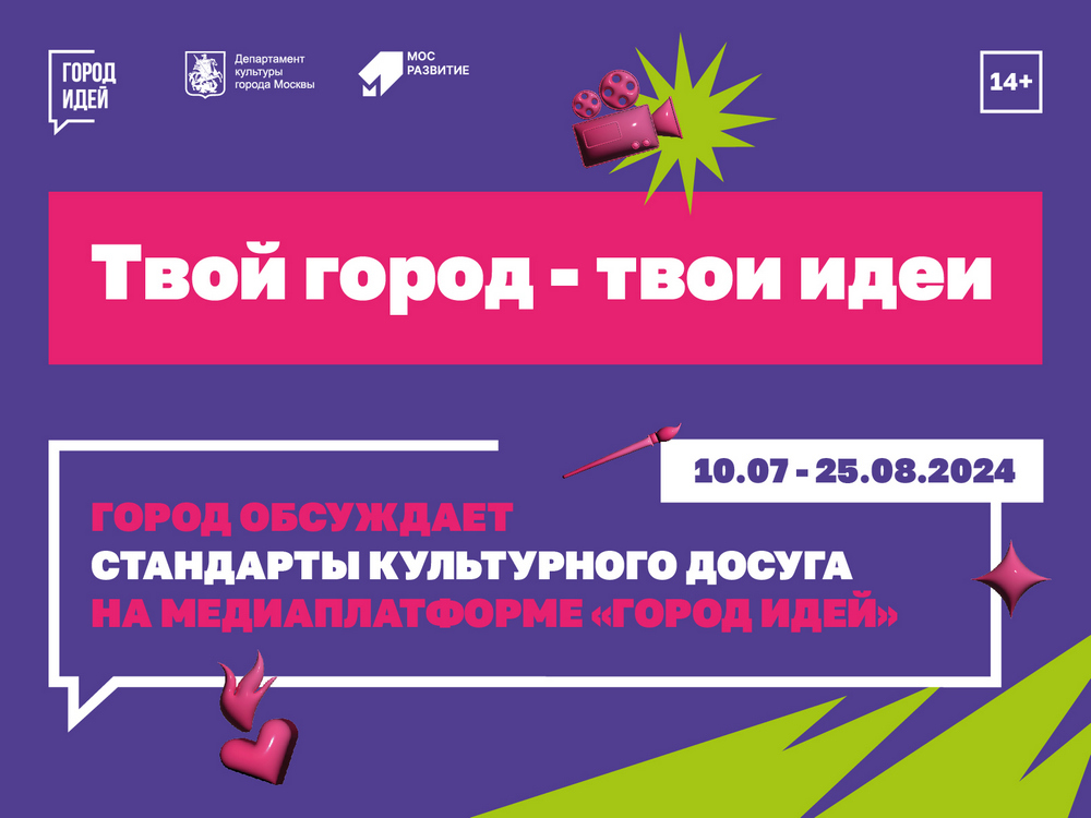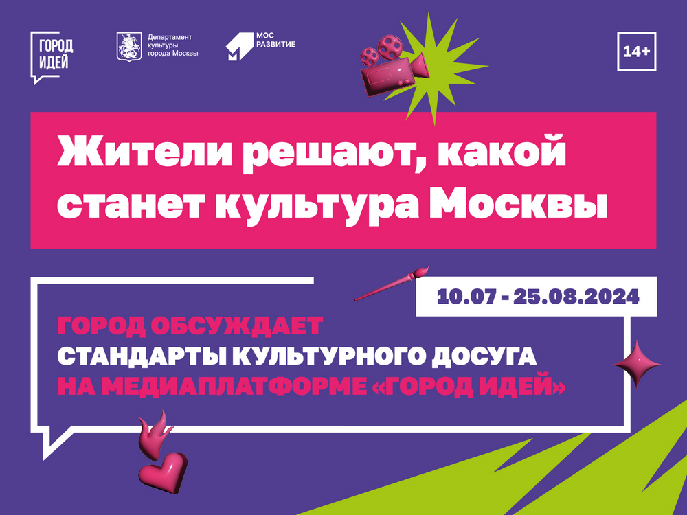 "Город обсуждает стандарты культурного досуга" – новый масштабный проект в формате медиаплатформы, где до 21 июля 2024 г. любой желающий сможет предложить идеи развития сферы культуры Москвы по 7 тематическим направлениям: