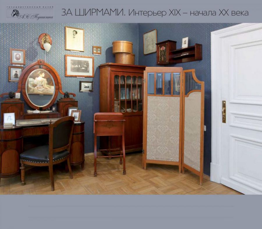 Интерьеры, созданные по мотивам классических литературных произведений, демонстрируют предметы убранства и быта XIX – начала XX века из коллекции Государственного музея А.С. Пушкина и частных собраний. В каждой из представленных обстановок особый акцент делается на ширме – весьма распространенной и модной детали прошлых веков.