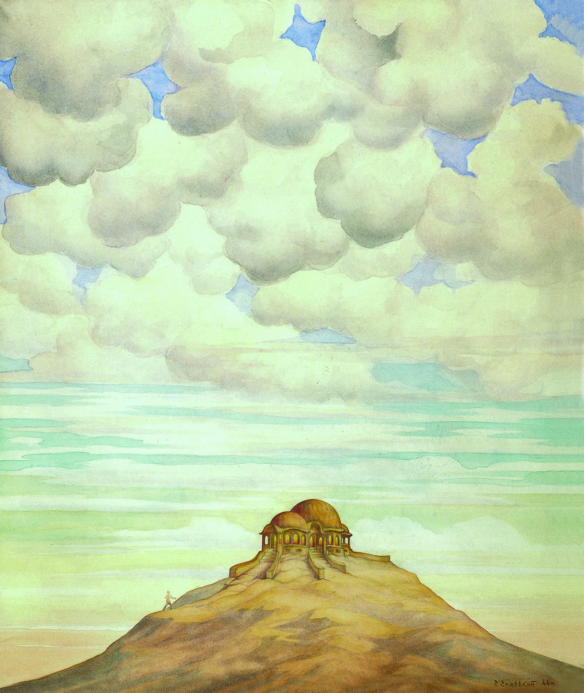 Художник Евгений Дмитриевич Спасский (1900–1985) в своей работе «Храм Духа» (1944. Бумага, акварель) изобразил не просто абстрактный Храм, не воображаемое хранилище Духа, это – антропософский центр и храм, возведенный по проекту и по эскизам Рудольфа Штейнера в Дорнахе (Швейцария) в 1913–1922 гг. На это указывают два характерных купола (большой и малый), витражные окна и расположение на холме.