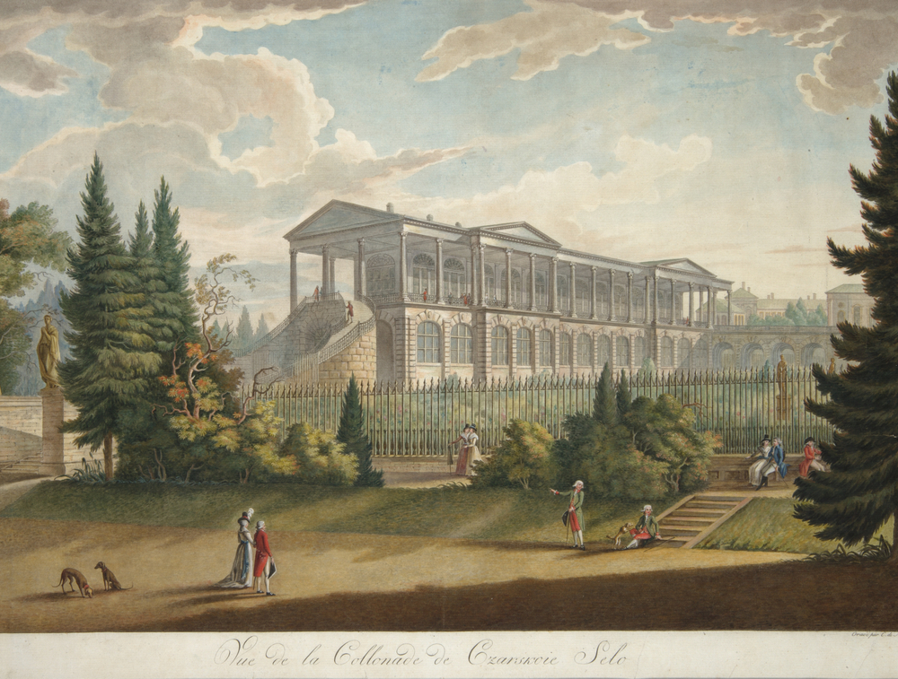 И.Г. Майр Вид Камероновой галереи в Царском Селе. 1793 Бумага верже, акватинта, офорт, акварель, белилаВ первом разделе выставки демонстрируются материалы биографического характера. Поэт, принадлежавший к старинному дворянскому роду, родился в 1799 году в древней столице России – Москве. В 1811–1817 годах он учился в Царскосельском Лицее, после – жил в Петербурге. В этот период им написана поэма «Руслан и Людмила», работа над которой закончилась в 1820 году. В том же году за вольнолюбивые стихи Пушкин был удален из Петербурга на юг России, где создал романтические поэмы «Кавказский пленник» и «Бахчисарайский фонтан». Формально поэт не был сослан: его отъезду был придан характер служебного перевода. С семейством прославленного генерала Н. Н. Раевского в 1820 году Пушкин путешествовал по Крыму и Кавказу, затем уехал в Кишинев. В 1823 году он получил назначение в Одессу, а в 1824-м был отправлен в новую ссылку, в «глухую деревню» Псковской губернии – родовое имение Пушкиных, село Михайловское. В михайловской ссылке Пушкин завершает работу над поэмой «Цыганы», пишет несколько глав романа «Евгений Онегин», трагедию «Борис Годунов», десятки стихотворений. В 1826 году поэт был возвращен из ссылки новым царем Николаем I. Пушкин приехал в Первопрестольную во время коронационных торжеств. Москвичи устроили ему восторженный прием – он находился в зените своей славы. Один из современников писал: «Завидую Москве. Недавно она короновала императора, теперь коронует поэта». В 1831 году Пушкин обвенчался с первой московской красавицей Натальей Гончаровой и начал семейную жизнь. В 1830-е он жил в Петербурге – городе, с которым были связаны годы его юности и годы творческой зрелости, наивысшего напряжения духовных сил и житейских невзгод. «Град Петров» неоднократно воспет им в стихотворениях, поэмах и прозе.  В 1837 году на дуэли с кавалергардом Жоржем Дантесом Пушкин был смертельно ранен, защищая честь жены и свое имя, которое, по его словам, «принадлежало России».