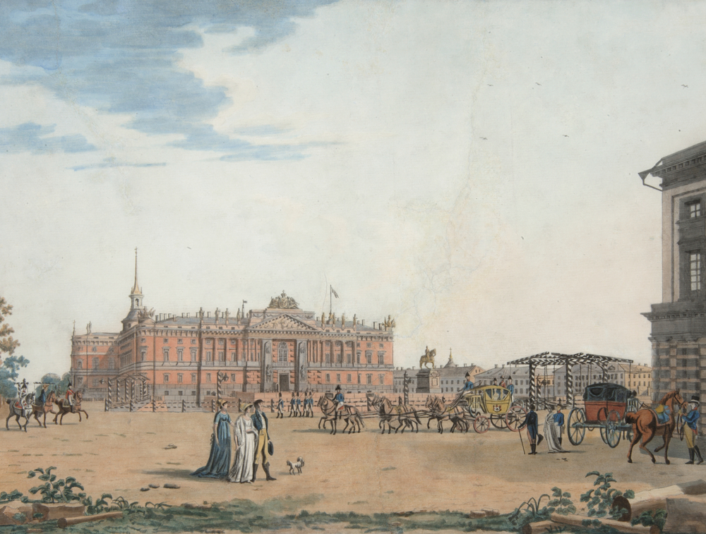 Б. Патерсен Петербург. Главный фасад Михайловского замка. 1807 Бумага верже, гравюра очерком, акварельВ этом разделе экспозиции представлены изображения самого Пушкина и его родителей, портреты современников – литературных единомышленников и противников, друзей и недругов. Каждому из них поэт посвятил стихотворное или прозаическое послание, иногда всего несколько строк – восхищения, любви, дружеской привязанности или откровенной неприязни. Пушкинские строки, сопровождающие портреты, помогают нам лучше понять и личность каждого из изображенных, и характер их отношений с Пушкиным. В акварелях, гравюрах, литографиях и живописных полотнах перед нами предстает Россия первой трети XIX века. Здесь можно видеть родину Пушкина – «премилую старушку» Москву, Царское Село, Петербург, Крым, Кавказ, Одессу… Атмосферу эпохи помогают почувствовать прижизненные издания пушкинских произведений и предметы декоративно-прикладного искусства.