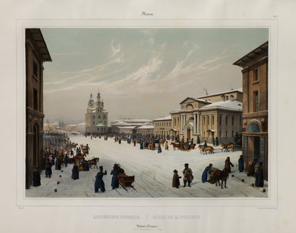 Дациаро И.Х. (Издатель). Гюисдон А. (Литограф). Дитц С.Фр (Авторы рисунка). Здание Благородного собрания. Вид от угла Театральной площади на Охотный ряд в сторону церкви Параскевы Пятницы. Из серии "Moscou"В бывшей Немецкой слободе поэт родился и провел детские годы. На Тверской, Покровке. Мясницкой, Большой Дмитровке, Кузнецком Мосту, Поварской, Пречистенке, Покровке, Тверской, Старой Басманной, Большой Никитской и других улицах жили его друзья и знакомые; располагались гостиницы, типографии, книжные лавки, магазины и ресторации. Также тесно, как и судьба Пушкина, с Москвой связано творчество поэта, которое невозможно представить без «московских строф» романа «Евгений Онегин», без писем и стихотворных посланий...