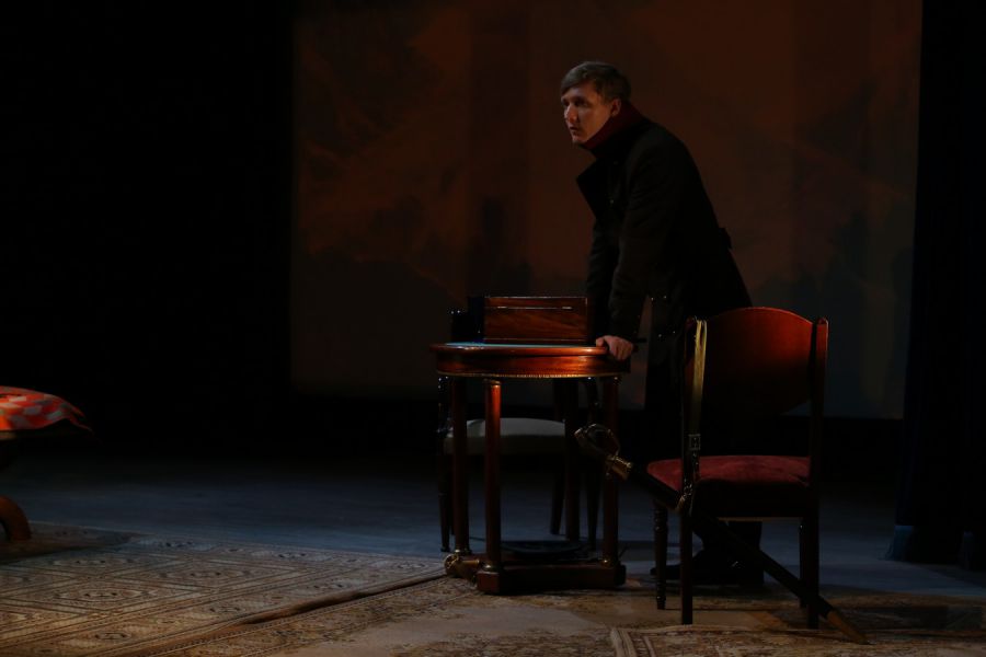 Режиссер спектакля Андрей Беркутов намеренно дистанцирует Героя от известных сцен и других действующих лиц знаменитых произведений –  оставляет его наедине с собой, показывает без привычной маски, за которой тот скрывает от окружающих свою истинную личность.